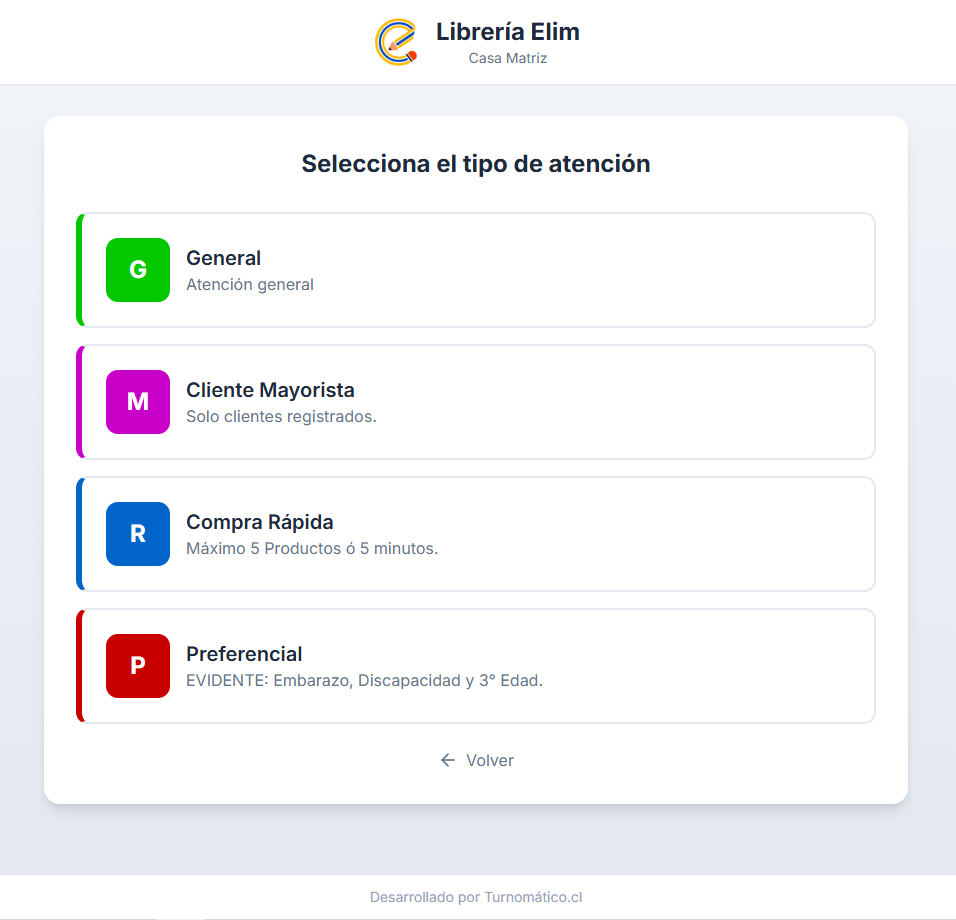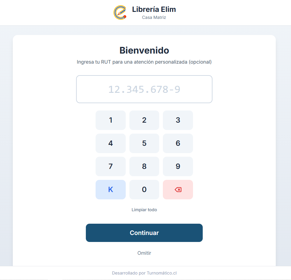 - Kiosko, donde el cliente toma su Turno, ingreso opcional con o sin RUT, puedes Categorizar o Seccionar Turnos, ejemplos: Turno General, Turno Preferencial o "Cajas", "Atención al Cliente", etc. y dar prioridades de atención según la categoría o sección.