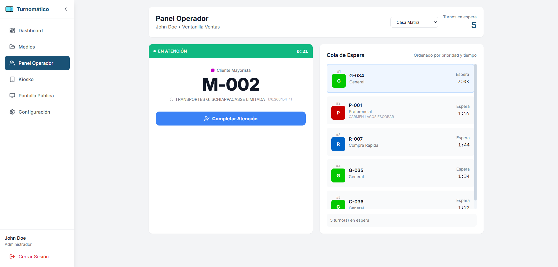 - Panel del Operador, donde los operadores, llaman a los clientes / turnos en espera, gestión de turnos ausentes y rellamados.
